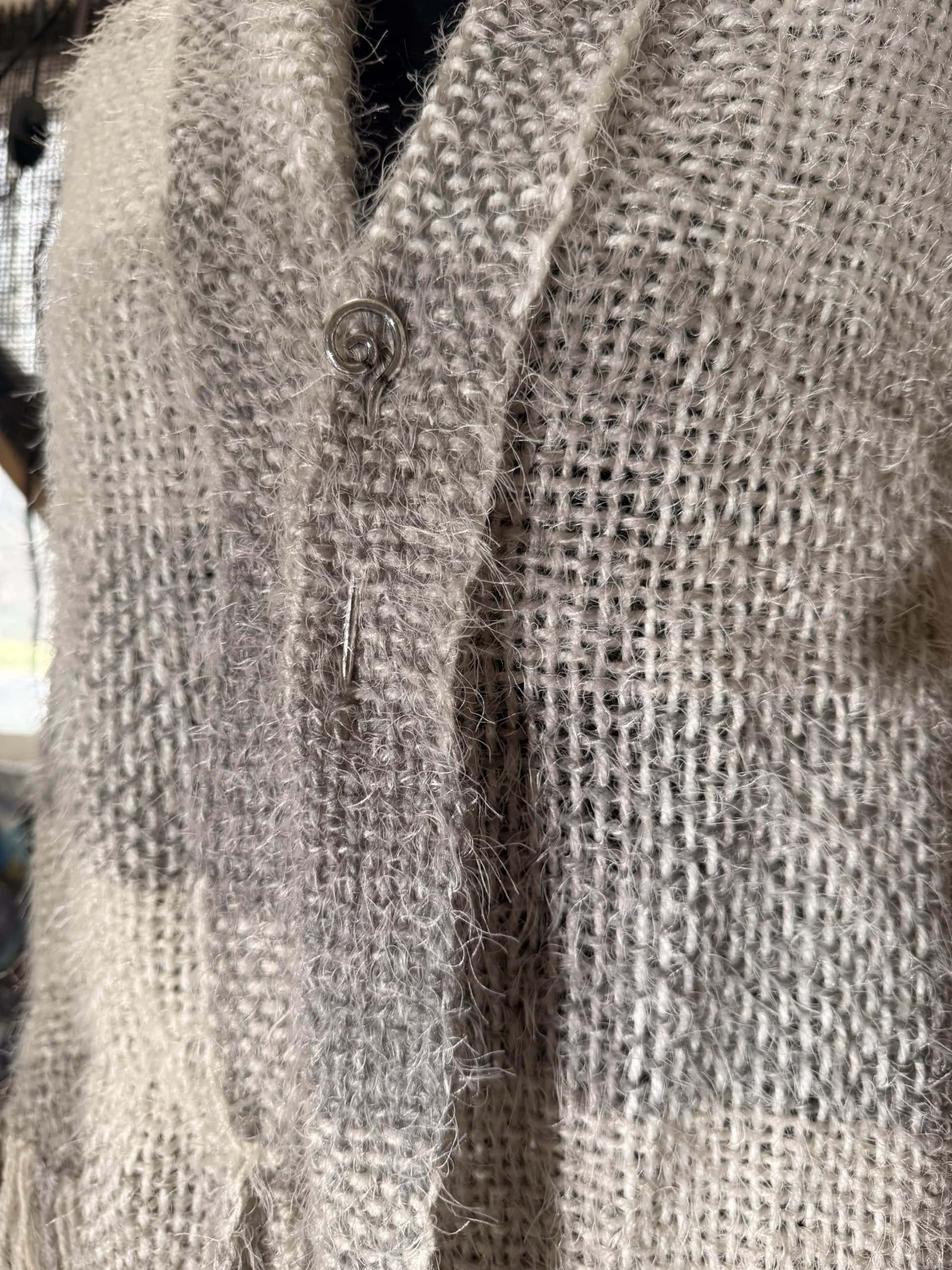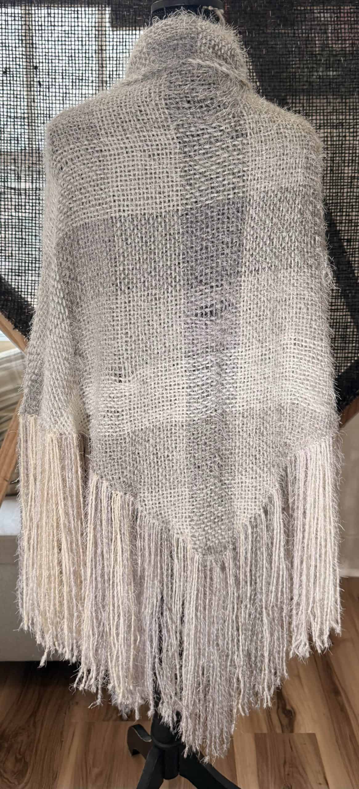 Hand-woven, Fringed Shawl in Acrylic Yarn. This shawl was woven on a 7ft Triangle Loom. Soft and lightweight in beautiful grey hues. Just the right shawl for lightly chilled days. $175