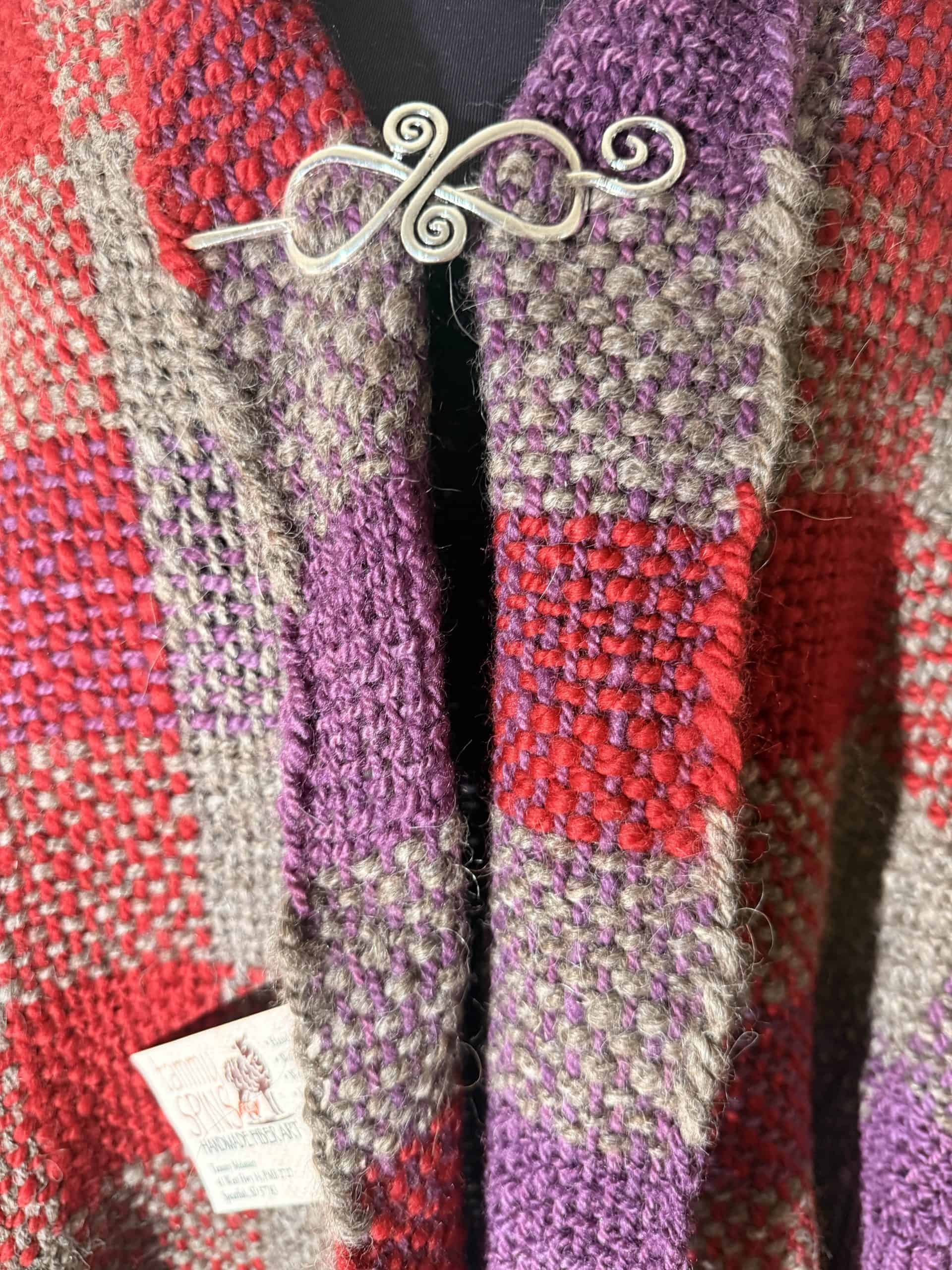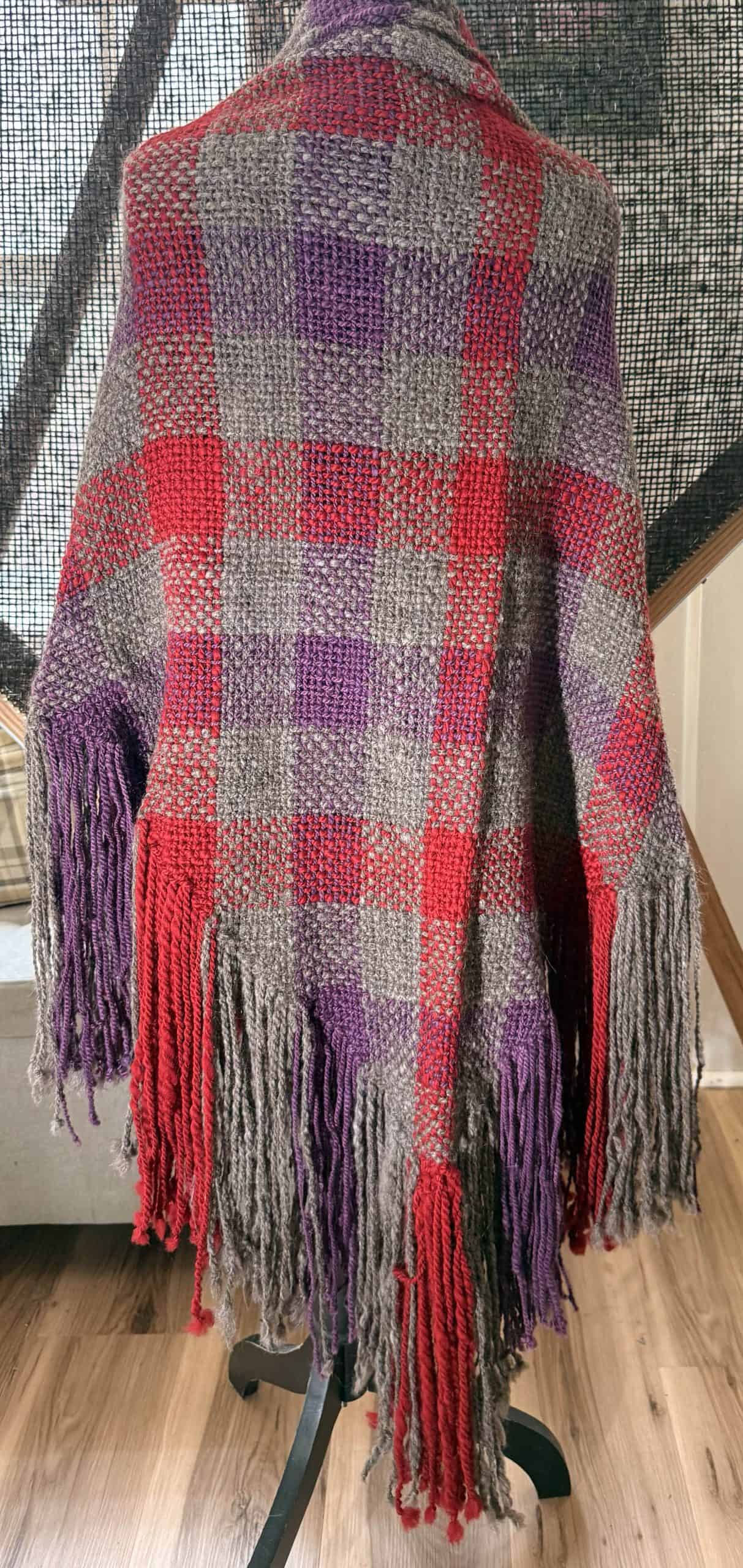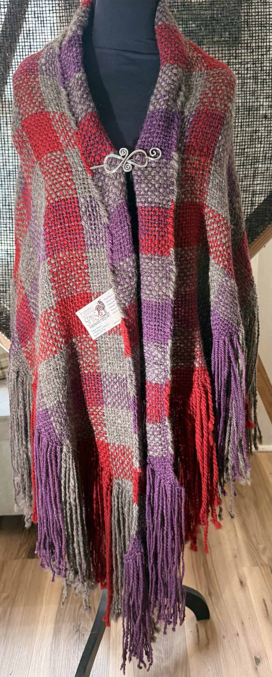 Hand-Spun, Hand-Dyed & Hand-woven, Fringed Shawl in 100% Shetland Wool. This shawl was woven on a 7ft Triangle Loom. Soft and warm in beautiful Cadmium, Deep Purple and Natural Grey. Hand wash in cold water and lie flat to dry. Price includes free shipping in the US $350.00